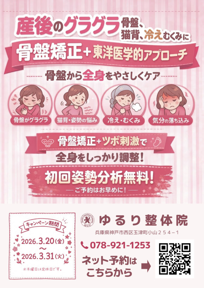神戸市西区のゆるり整体整骨院では、骨盤矯正だけではなく、東洋学の考え方も取り入れながら、産後のお母さんの身体を優しく整えていきます。